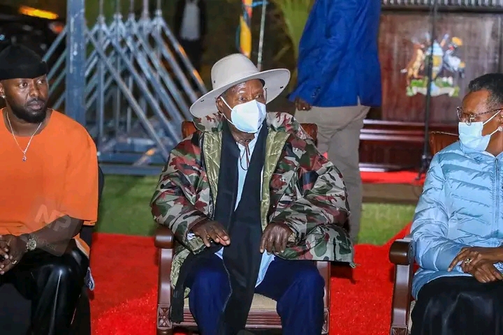Pulezidenti Museveni ne mukyala we nga bekubya ekiffananyi ekyekijjukizo ne Eddy Kenzo eyawombye omutwe mu ntekateeka eno
